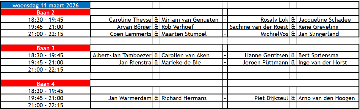Senioren - Duco speelschema woensdag 11 maart 2026