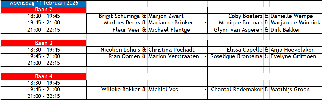Duco - Speelschema woensdag 11 febuari 2026