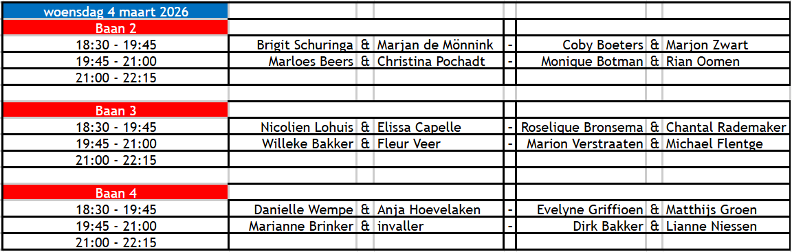 Senioren - Duco speelschema woensdag 4 maart 2026